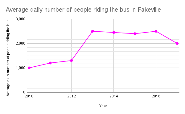 This line graph __________ the average daily number of bus riders in Fakeville.