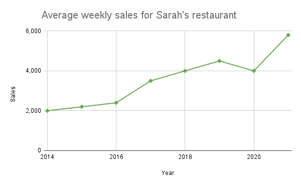 This line graph __________ the average weekly sales for Sarah's restaurant from 2014 to 2021.